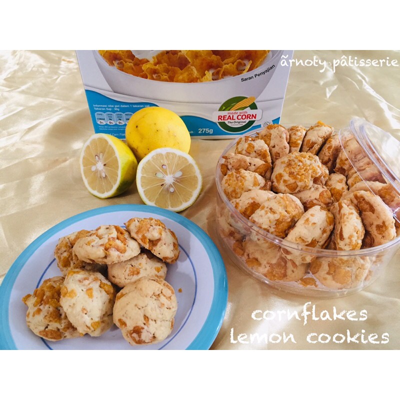 kue kering menggunakan bahan premium dengan rasa dan aroma butter yang kuat serta aroma dan rasa lemon, dengan campuran cornflakes sehingga lebih crunchy.