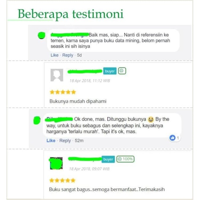 Selanjutnya, buku ini akan membahas bagaimana cara melakukan big data analytics menggunakan framework big data yang saat ini paling populer, yaitu Apache Spark, dengan disajikan hands-on coding step-by-step, mulai dari data pre-processing hingga pemecahan masalah yang meliputi: regresi, klasifikasi, sentiment analysist data twitter, klastering hingga membuat sistem rekomender untuk rating movie. Terakhir, akan dipandu bagaimana cara membuat dan menggunakan klaster komputer menggunakan Apache Spark tersebut, agar proses big data analytics menjadi cepat dan handal. Bagi yang belum familiar dengan pemrograman Python & Apache Spark, disediakan juga lampiran tutorial instalasinya di buku tersebut, dan juga ada bonus video tutorial pemrograman Python