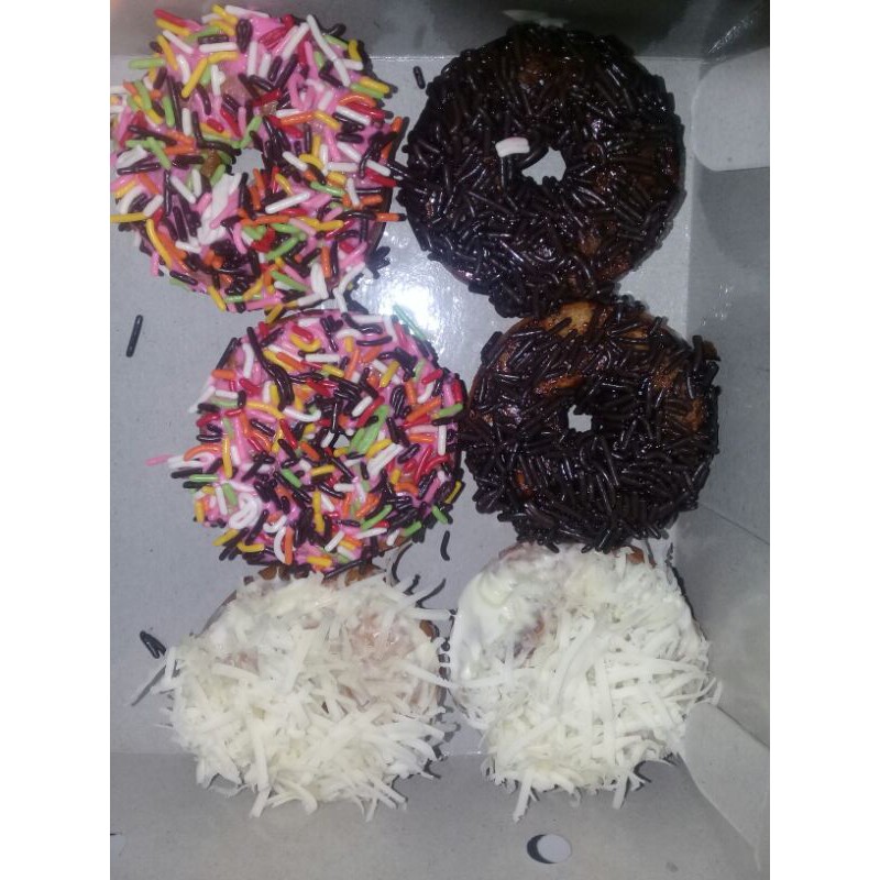 donat dengan taburan keju, ceres coklat dan ceres warna