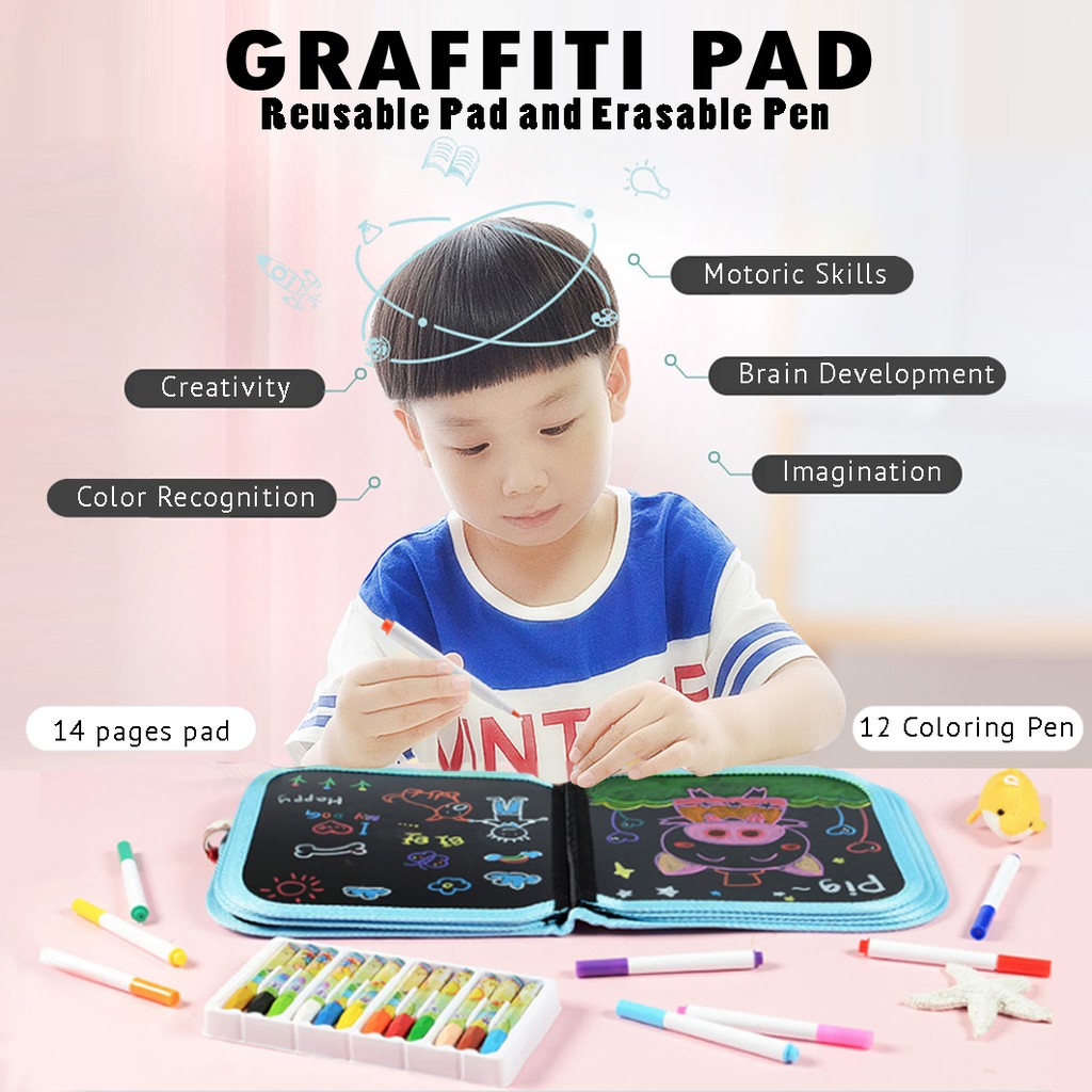 Reusable Graffiti pad, Buku menggambar ini dilengkapi dengan 12 pena warna-warni dan dapat dengan mudah dibersihkan dengan tisu basah tanpa bekas.
