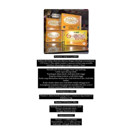 Terbuat dari bahan alami dan diproses dengan teknologi terstandarisasi. CNI Ester-C Plus adalah vitamin C generasi terkini yang memiliki kelebihan dibandingkan dengan vitamin C biasa :