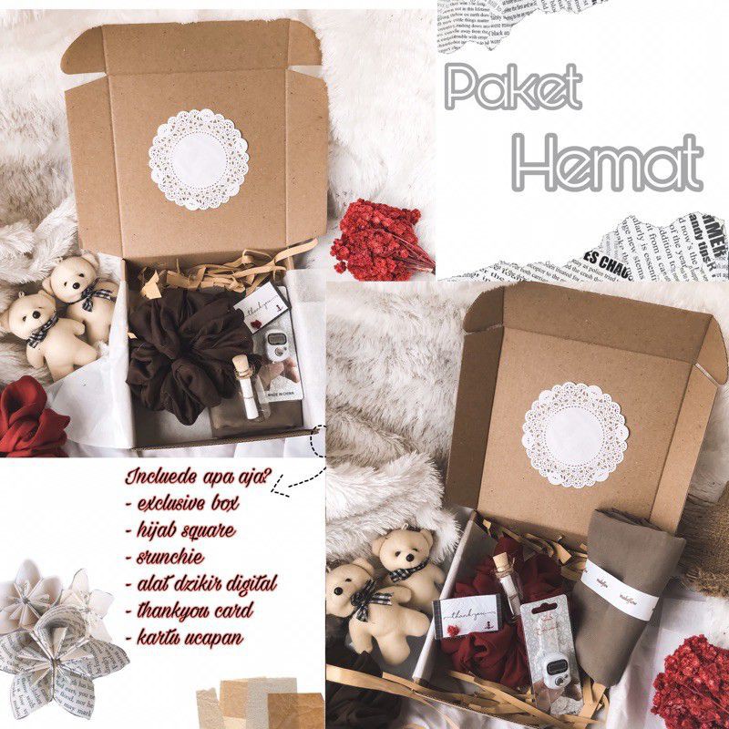 PAKET HEMAT : Gift box cantik, Hijab square, Tasbih digital, Ikat rambut cepol, Thankyou card, Greeting card