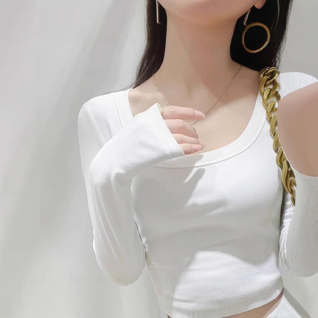 hhh Весна и Осень Чистый Стиль U-образный вырез Приталенная Футболка с Длинным Рукавом Универсальная Small белый
