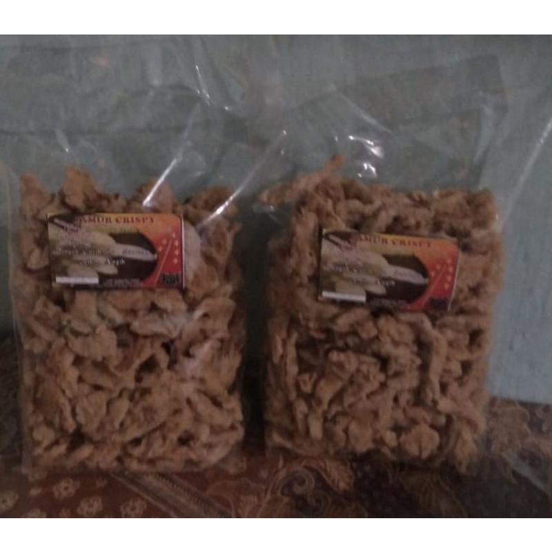 terbuat dari jamur tiram segar yang diolah jadi crispy, dijamin tidak serik dan endulita, netto 250 gram