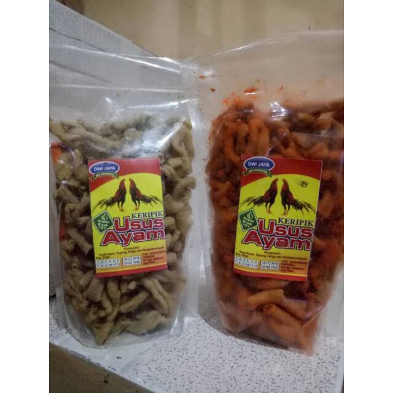 keripik usus adalah terbuat dari usus ayam yang dikasih bumb rempah rempah dan dibaluri tepung terigu untuk menambah kegurian keripik usus tersebut,keripik usus ini sangat cocok dijadikan saat cemilan maupun sedang bersantai ataupun bisa juga dijadikan lauk saat makan.
