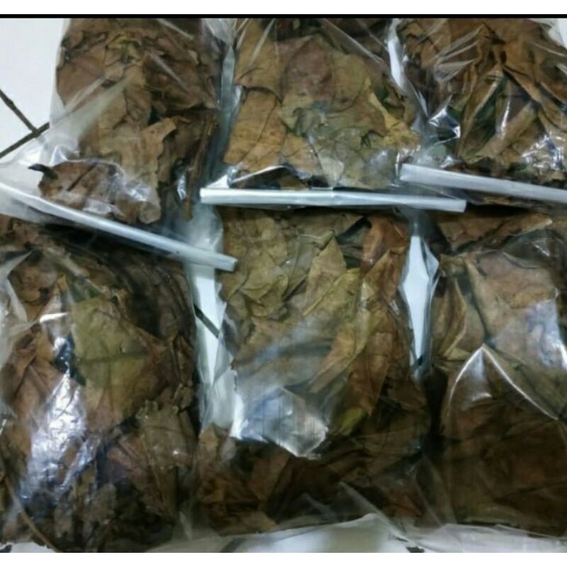 Daun ketapang olahan, daunnya lebar2. Hasil ekstrak berwarna kemerahan..
