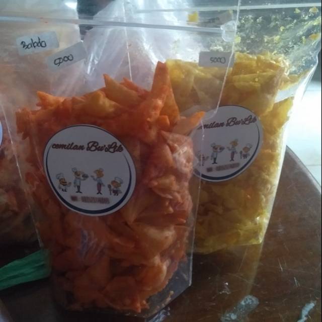 kripik pangsit. tersedia varian rasa pedas sapi panggang bbq jagung bakar jagung manis