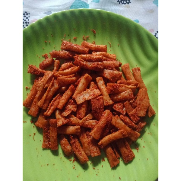 Kripik pangsit dicampur bumbu pedas yang akan membuat bibir menjadi dower