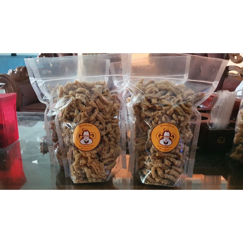 kripik usus dengan tempat pouch 500 gram