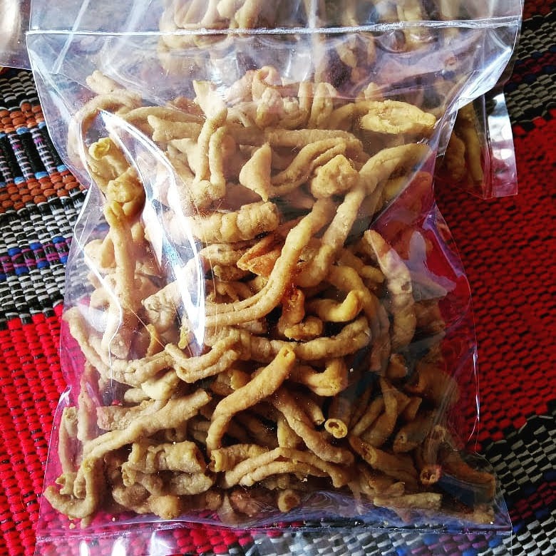 terbuat dari usus ayam yang di olah menjadi kripik .