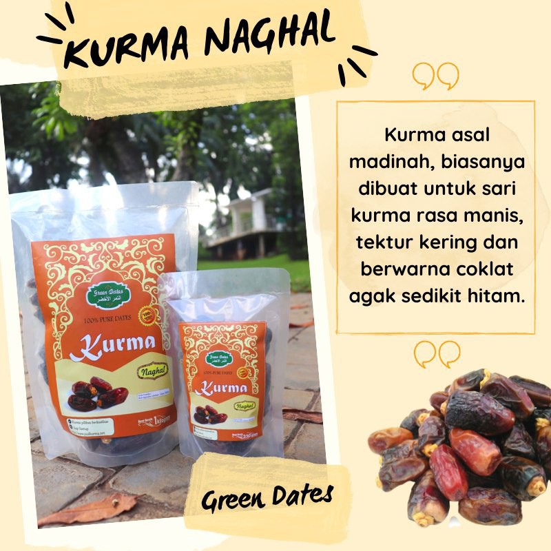 Kurma Naghal memiliki tekstur yang kering dan ukuran yang besar, rasa manis dan berwarna coklat agak sedikit kehitaman.