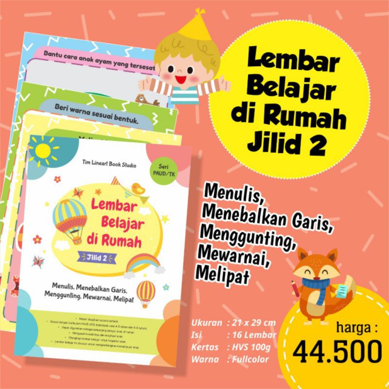 Konsep aktivitas anak bukan berupa buku tapi berupa lembar belajar. Berisi banyak tema mulai dari menulis, membaca, mewarnai, angka, gunting tempel dsb.