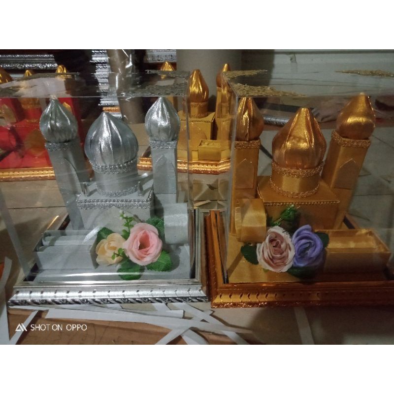 tempat perhiasan model mesjid (kalung gelang cincin) bahan abutay.. baki frem 15cmx20cm tutup.mika tinggi 22cm