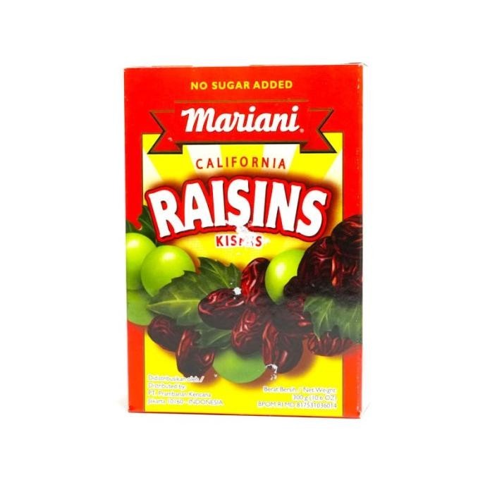 Kismis merk Mariani Tumbuh di bawah sinar matahari California, kismis Mariani bebas lemak jenuh. Kismis yang lezat ini tidak hanya digunakan untuk bahan olahan, tapi bisa dimakan langsung. Gunakan untuk menaburkan sereal atau salad, tambahkan ke resep favorit, atau sebagai camilan sehat saat bepergian. Manfaat kismis: Menyehatkan pencernaan, Membantu mengurangi berat badan, Menjaga kesehatan jantung dan mulut