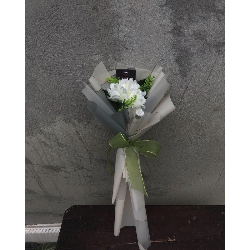 mini bucket bunga artificial dengan satu tangkai bunga tapi menggunakan kertas bucket premium sehingga hasilnya cantik dan elegan