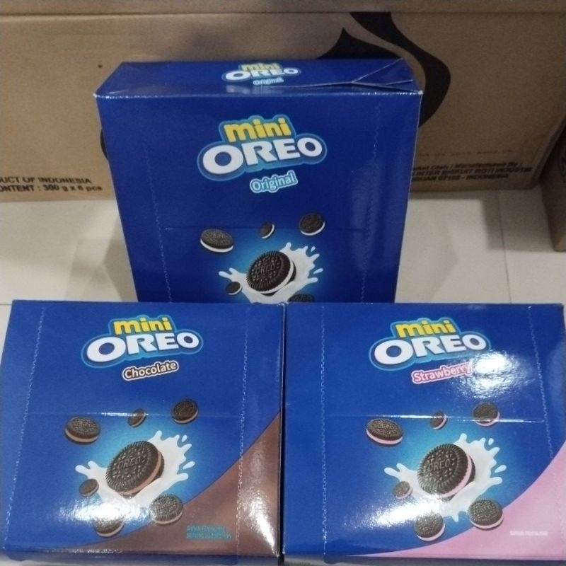 Biskuit sandwich cokelat dengan krim rasa cokelat, stroberi, dan vanila