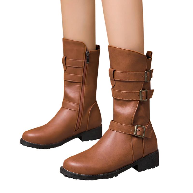 Buckle Strap Brown Winter Boots Fashion Pure Color Round Toe Zipper Square Heels Vintage Shoes Woman Warmer Hiking Snow Boots, Black