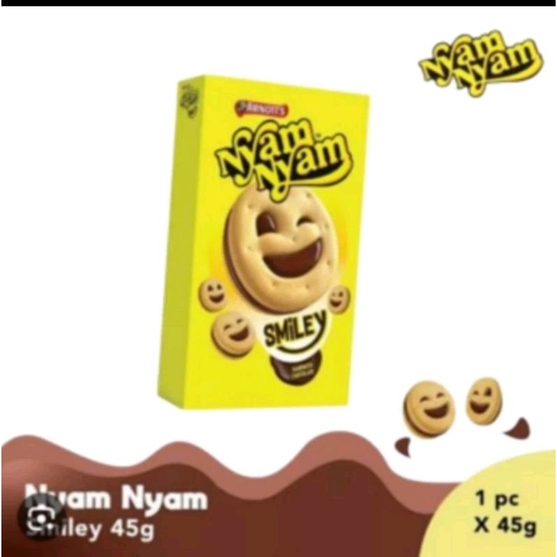 Nyam Nyam Smiley hadir dengan bentuk biskuit yang menarik serta terdapat pesan lucu disetiap kemasannya, ayo cobain!