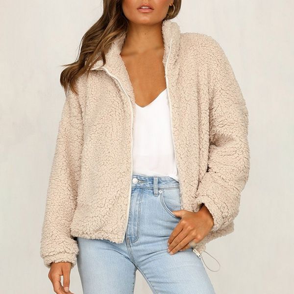 oeak 2019 женская мода с длинным рукавом отворот на молнии из искусственной короткой шерсти мохнатое пальто теплое зимнее плюшевое пальто, Black;brown