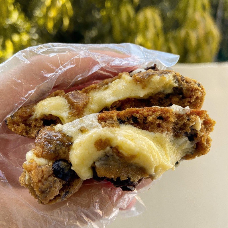 soft baked cookies with oreo dough , centered with melted sweet cream cheese