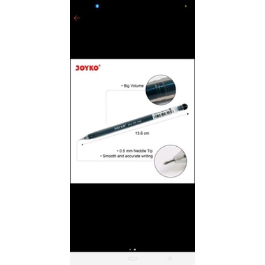 pen gell joyko dengan tinta warna hitam dengan ukuran diameter 0,5mm cocok di gunakan untuk menulis d atas kertas ..