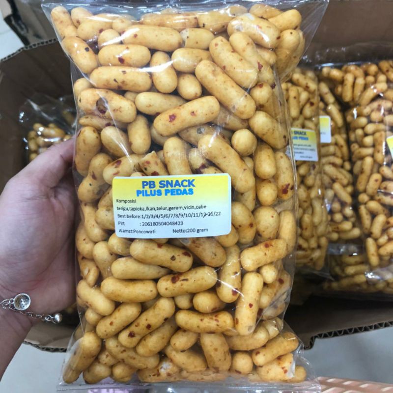 pilus pedas dikemas dengan berat 200gr. isian banyak. cocok untuk cemilan maupun dimakan bersama nasi