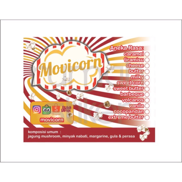 Packaging popcorn terbuat dari plastik bermutu yang ditambahkan dengan zipper pada bungkusnya agar tetap menjaga kondisi popcorn dalam keadaan renyah apabila sudah dibuka.