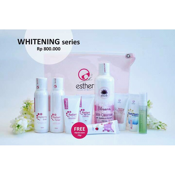 Rangkaian produk esther yg berfungsi u tuk mencerahkan wajah, melembabkan, mengenyalkan serta membersihkan kulit wajah... Bisa beli per satu set or per item.