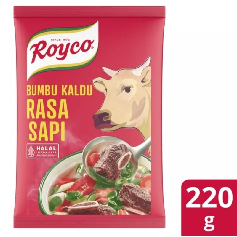 Royco Bumbu Penyedap Makanan Rasa Kaldu Sapi 220 gr merupakan bumbu pelezat masakan yang terbuat dari bahan-bahan dan rempah pilihan, termasuk daging sapi pilihan yang direbus lama. Memberikan rasa kaldu yang mantap pada masakan Anda.