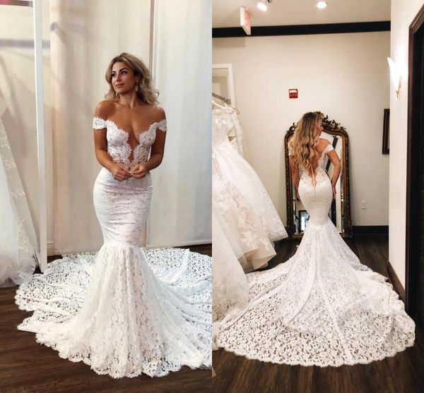 sexy off плеча полный шнурок mermaid свадебные платья в стиле ретро открыть назад sweep поезд плюс размер свадебные платья bc2771, White