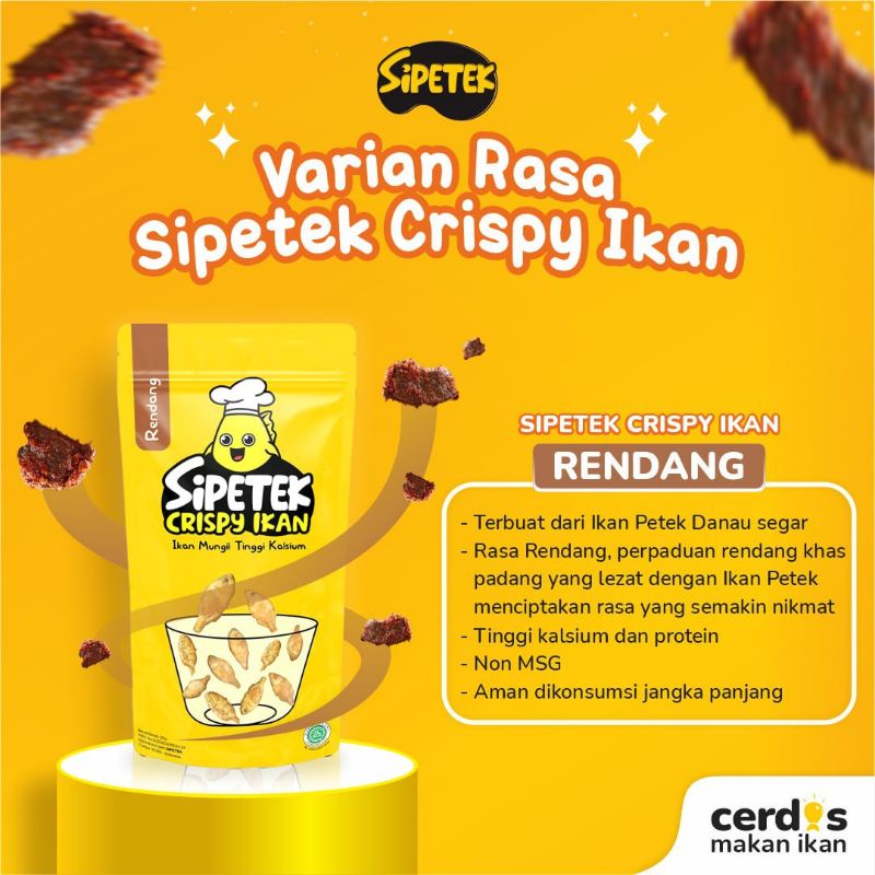 Sipetek Crispy Ikan adalah ikan goreng berukuran mungil yang renyah dan kriuk cocok untuk cemilan maupun lauk makan. Terbuat dari ikan petek danau yang memiliki kandungan kalsium dan protein tinggi, tentunya sangat baik untuk pertumbuhan dan tumbuh kembang anak