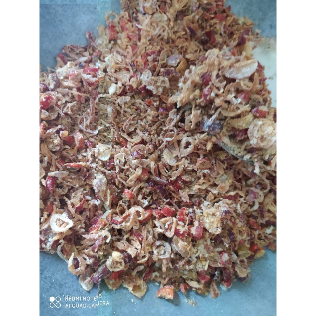 bawang goreng di padu sama cabai ditambah racikn,dposes sedemikian rupa,rasanya pedas ,gurih,nikmat,dan kriuk