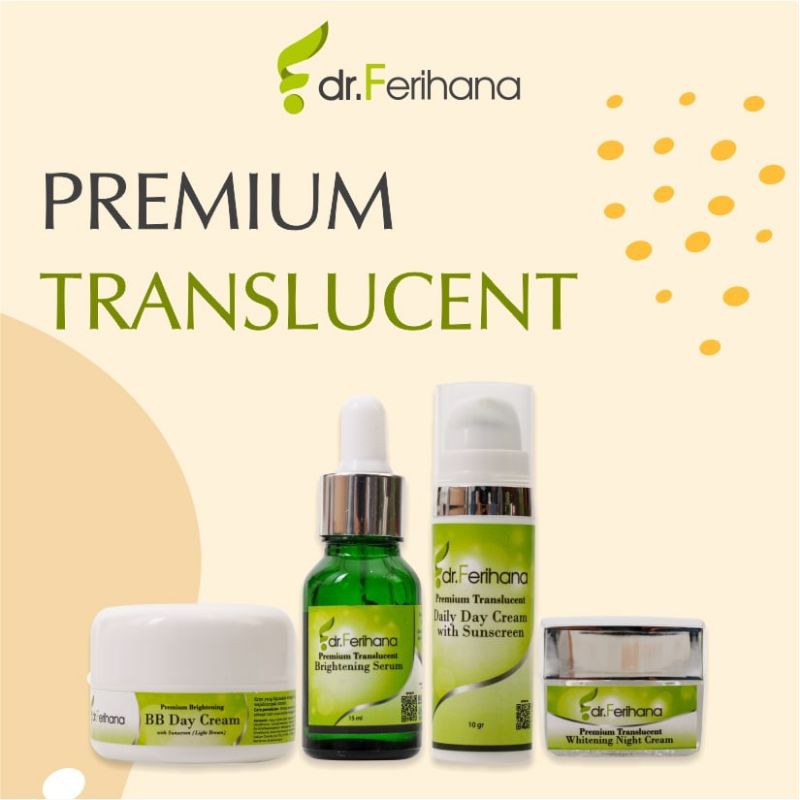 Translucent adalah produk premium dari dr. Ferihana yang diformulasikan khusus untuk kulit yang bermelasma. Dengan kandungan bahan alami yang memeiliki manfaat baik untuk kulit wajah, membantu membersihkan flek hitam diwajah secara menyeluruh. Tidak hanya itu produk Translucent juga mengandung galactomyces yang bermanfaat mencerahkan kulit wajah lebih cepat dan tentunya aman tanpa efek samping.
