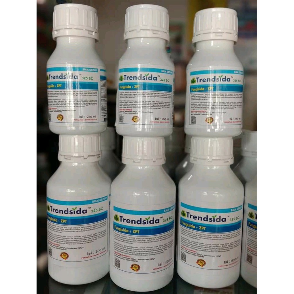 FUNGISIDA TRENDSIDA DENGAN TEKNOLOGI TERBARU DAN PERTAMA DI INDONESIA Bahan aktif Trendsida325 SC Fungisida+ZPT adalah: 325 sC : g/L, adalah perpaduan 7 (tujuh) bahan aktif yaitu : klorotalonil + Azoxistrobin + PropinebWG + Difenokonasol + Oksitetrasiklin + Metil tiofanat + Mankozeb dan ditambah dengan Propamocard, 3 Cu Oxy sulpate. Cara kerja : SISTEMIK dan KONTAK. mimiliki kandungan ZPT didalamnya. Dengan 7 (tujuh) kekuatan bahan aktif yang memiliki konsentrasi seimbang sehingga sanggup dan mampu untuk perlindungan dan pengendalian berbagai virus dan jamur hampir semua tanaman. Fungsi utamaTrendsida325 SC adalah menghentikan pengembangan jamur dengan mengganggu biosintesis sterol dalam membran sel-sel jaringan pada tanaman serta memiliki kemampuan melekat atau bertahan lama pada tanaman dan aktivitas pencegahan dikombinasikan dengan sifat kuratif dan eradicant, serapan cepat dan gerakan translaminar tinggi. Manfaat Trendsida 325 SC : Mencegah Serangan berbagai cendawan, cendawan Alternaria porri, Layu daun, bercak ungu dan bercak daun, antraknosa, busuk pusarium & busuk buah, akar gada, embun tepung (Oidium SP) & embun bulu,hawar pelepah,bercak kering, karat, cacar daun (phyllestiescta SP), Rebah batang, kudis, Sigatoka,Blendok, patik,tipis pada kulit, bulir Cerah dan, blass (PyriculariaGrisea) dan POTONG / PATAH / BusukLeher.