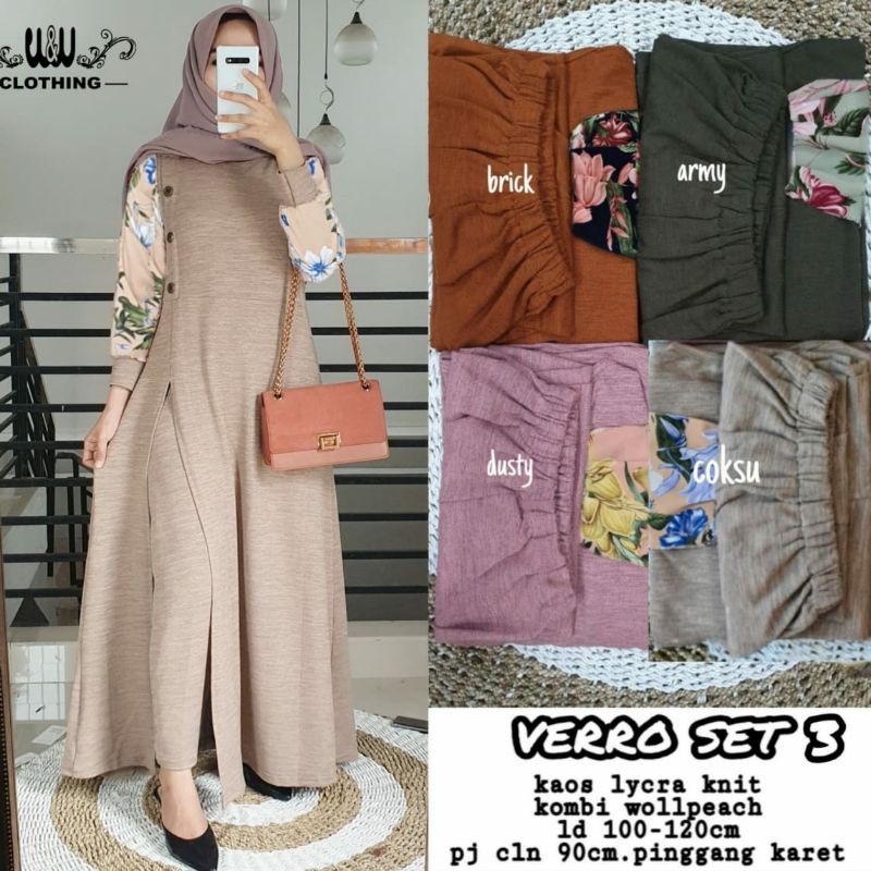 Verro Set 3 - kaos Lycra Knit - kombi wolpech - LD 100-120cm - Panjang Celana 90cm - pinggang karet Tersedia warna : coksu, dusty, army, brick WAJIB BACA Mohon tanyakan stok terlebih dahulu sebelum memesan karna perputaran barang sangat cepat. Di Sarankan untuk mencantumkan warna cadangan untuk mempercepat proses pengiriman Jika tidak chat dan langsung chekout akan dikirim sesuai keterangan ketersediaan stok ORDER = SETUJU sesuai kesepakatan diatas Transfer max jam 14.00 siang dan akan dikirim hari yang sama, transfer setelah jam 14.00 siang akan dikirim hari berikutnya.. Periksa kembali diskripsi produk untuk ukuran Gambar produk insyallah sesuai 100% real pict dan Original Jika menerima barang cacat/ salah warna complain 1x24 jam setelah barang diterima. Ongkir kami tanggung. MENERIMA DROPSHIP / RESELLER YANG MAU JOIN GRUP SILAHKAN CHAT KAMI. HAPPY SHOPING #gamis#busanamuslim#pakaianwanita#bajumuslim#busanawanita#pakaiansyairi#dress#dresgamis#tunik#dresssyari#setelan#verroset3byw&w;#w&w;#verroset3